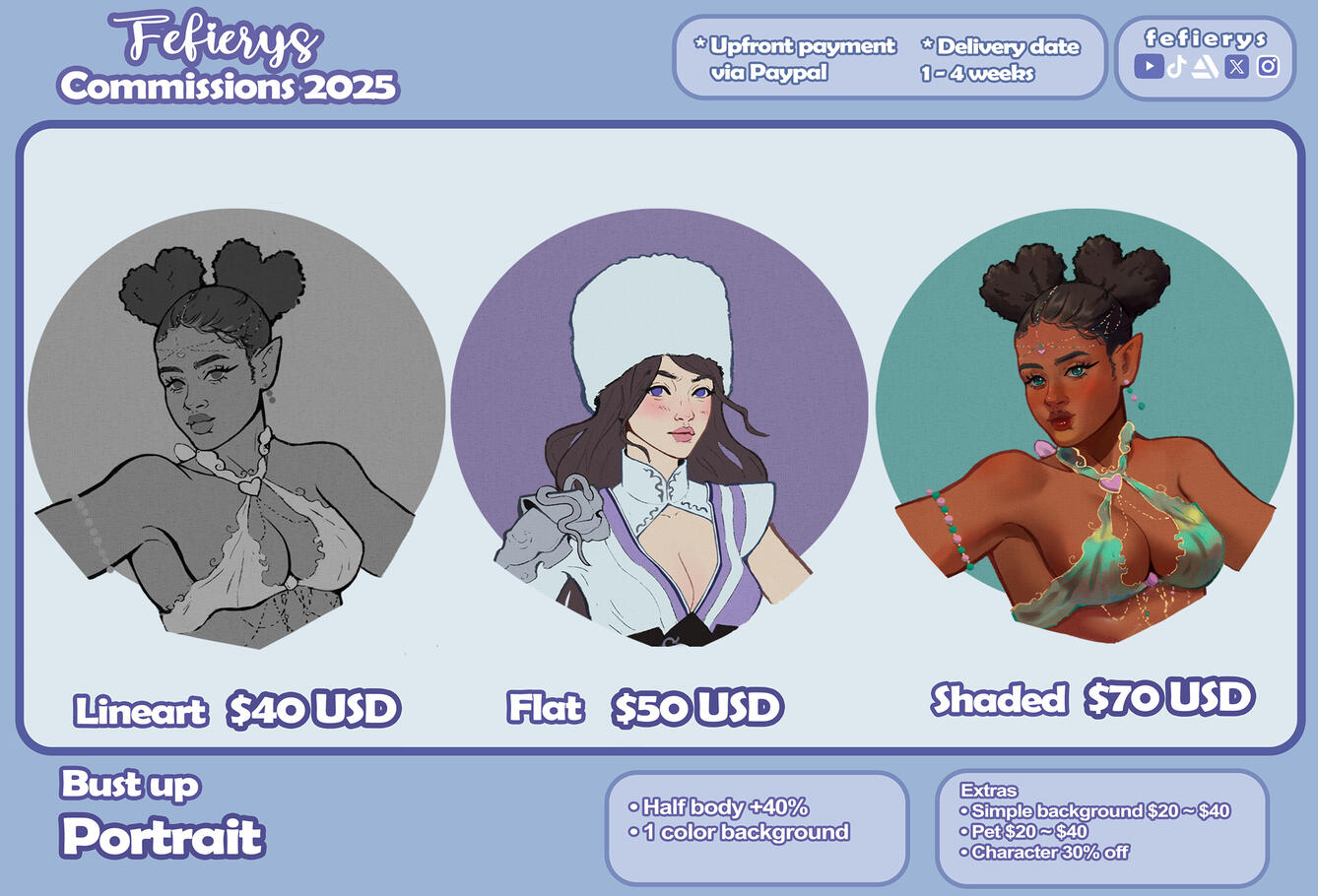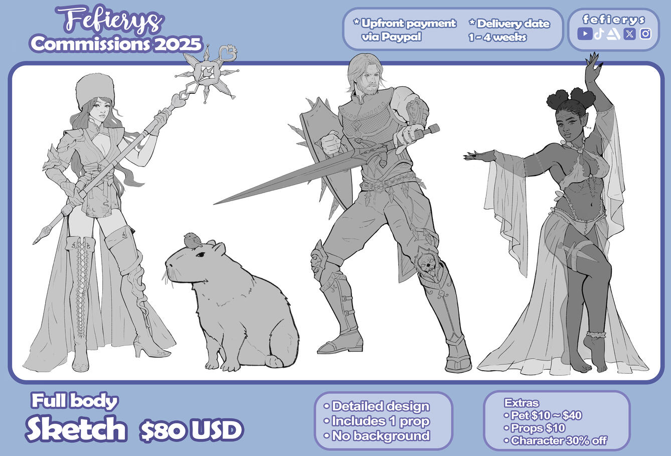 Prices are for personal use. All prices are listed in USD and can be paid through Paypal.Commercial use starts at $100, It will depend specifically on the project.Payment must be made in advance on commissions less than $150. For higher value commissions, 50% must be paid in advance and the rest after the sketch is delivered.Modifications are only allowed in the sketch phase and includes one revision, additional revisions costs $5 each, and it can only be small changes.Delivery date is 1-4 weeks from the sketch is approved (depends on complexity).For very detailed designs there may be an extra cost.Extra character discount is only for subjects in the same piece.