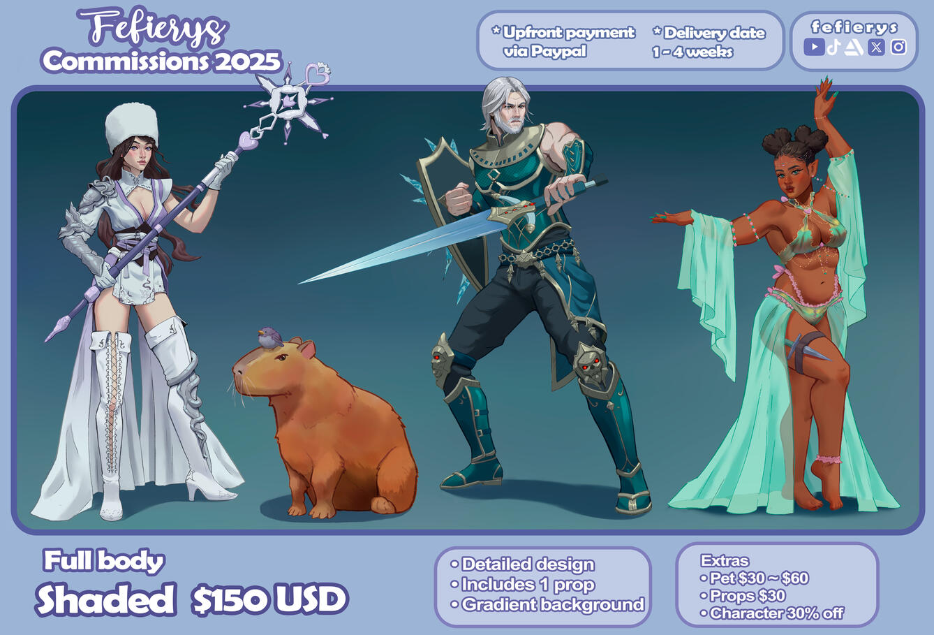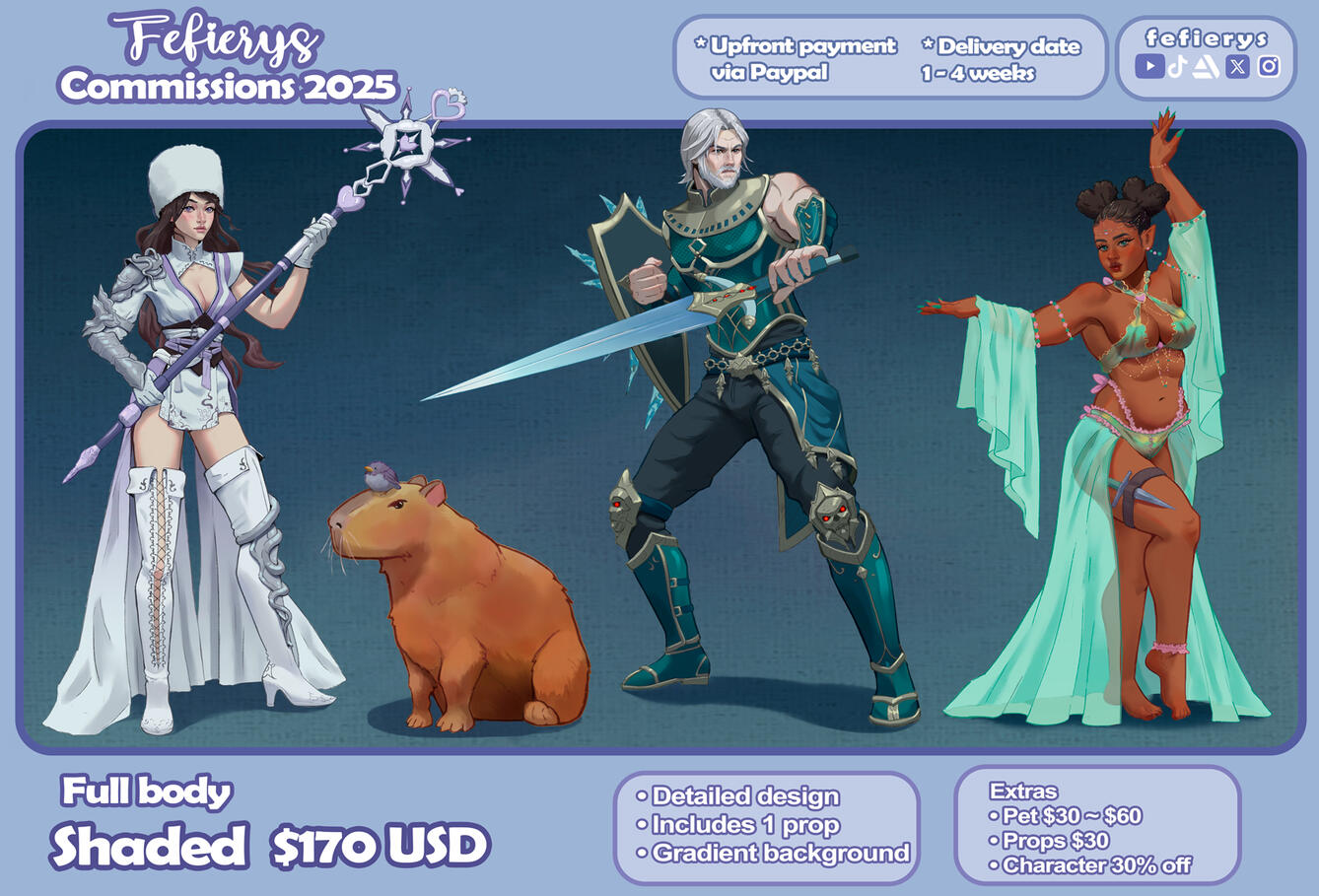 NSFW has an additional 30% charge and extra character discount doesn’t apply.You can request fast delivery for an additional price.I can display the commission in my portfolio/social media (You can request a private commission).No refunds